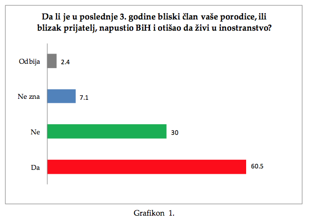 Najveći broj građana Bosne i Hercegovine (60,5%) doživio je da mu u poslednje tri godine u inostranstvo ode blizak član porodice ili blizak prijatelj. Svaki treći ispitanik (30,0%) nije doživio to iskustvo.