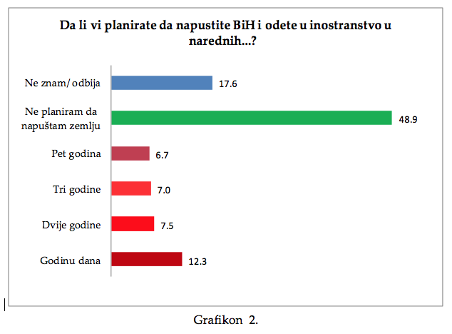 Rezultati istraživanja pokazuju da BiH ne planira da napusti 48,9% njenih stanovnika, dok 17,6% njih na ovo pitanje nije odgovorilo ili je kazalo da “ne zna”. U narednih godinu dana ovu zemlju planira da napusti 12,3% njenih stanovnika, u naredne dvije godine 7,5% stanovnika, tri godine 7,0% stanovnika, dok u narednih pet godina to će učiniti 6,7% stanovnika.