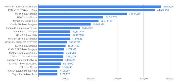 U 2019. godini od ukupnog broja kompanija u IT sektoru, 75,2% ostvaruje prihod do pola miliona KM, 20,7% kompanija do 5 miliona KM, a 4.1% kompanija više od 5 miliona KM.