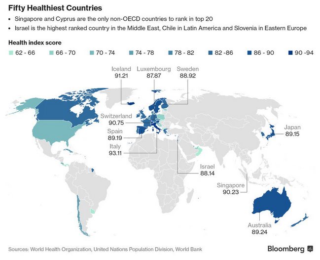 Bloomberg Global Health Index, koji je rangirao 163 nacije svijeta po zdravlju stanovništva, svrstao je naciju na Apeninskom poluotoku kao najzdraviju na svijetu, bez obzira na ekonomiju koja prolazi kroz teške izazove.