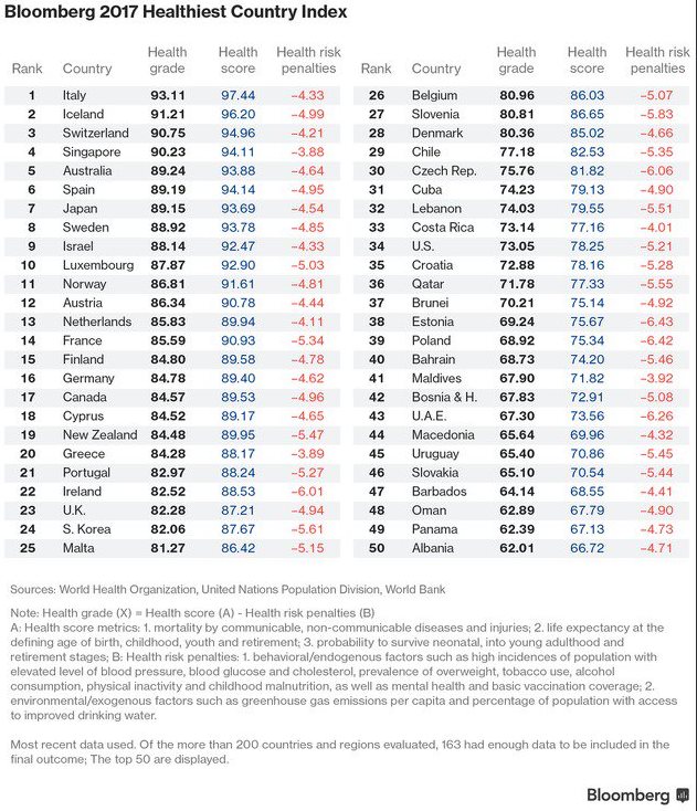 Italija je rangirana kao zemlja sa najzdravijim stanovništvom na svijetu. Bosna i Hercegovina je prema istom istraživanju svrstana na 42. mjesto, a susjedna Hrvatska na 35. Makedonija je na 44. mjestu.