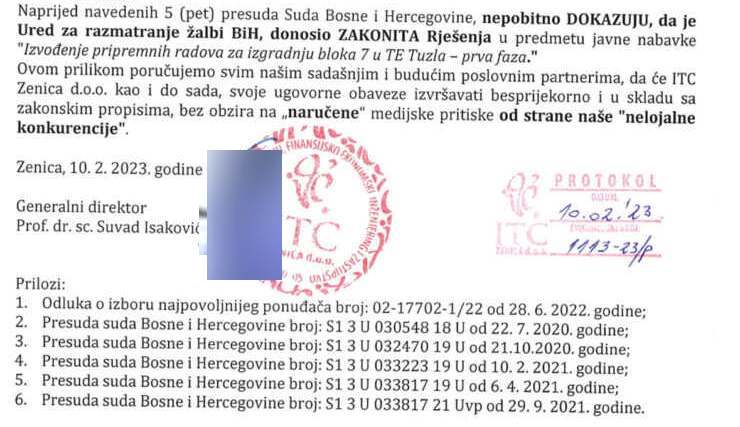 3) Ugovor broj 212 – KI – 19 ‘Izvođenje pripremnih radova za izgradnju bloka 7 u TE Tuzla – prva faza’, između konzorcija u kojem je ITC Zenica lider Konzorcija i JP EP BiH, zaključen je nakon više provedenih žalbenih postupaka pred Uredom za razmatranje žalbi BiH, u kojima su Uvažavane Žalbe konzorcija ITC i drugi. Po navedenom javnom postupku, protiv Rješenja Ureda za razmatranje žalbi BiH, podnesene su 4 (četiri) tužbe sudu Bosne i Hercegovine, od kojih je 2 (dvije) tužbe podnio nezadovoljni Ponuđač dok je druge 2 (dvije) tužbe podnijela JP EP BiH. Sud Bosne i Hercegovine presudama broj: 1) S1 3 U 030548 18 U 2) S1 3 U 032470 19 U; 3) S1 3 U 033223 19 U; 4) S1 3 U 033817 19 U, ODBIO je sve tužbe protiv Rješenja Ureda za razmatranje žalbi BiH, kao NEOSNOVANE (dokazi u prilogu). Sud Bosne i Hercegovine, također je presudom broj: S1 3 U 033817 21 Uvp od 29. 9. 2021. godine, odbio zahtjev nezadovoljnog Ponuđača za preispitivanje navedenih presuda, kao NEOSNOVAN.
