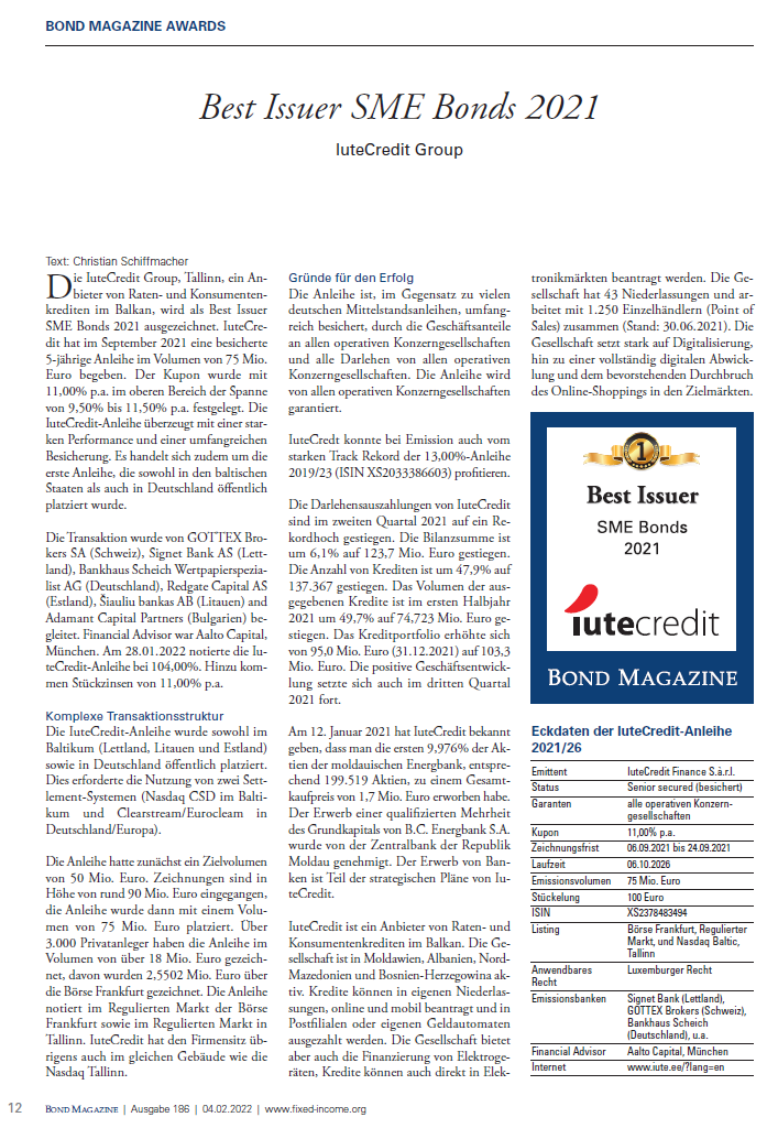 IuteCredit je prošle godine emitovao obveznice u vrijednosti od 75 miliona eura i sada je proglašen emitentom godine. Emitente godine svake godine bira Bond Magazine, publikacija o mogućnostima investiranja za Evropu na njemačkom jeziku. Bond Magazine je etabliran kao referentno tijelo za praćenje rada emitenata obveznica i investitora na tržištu.