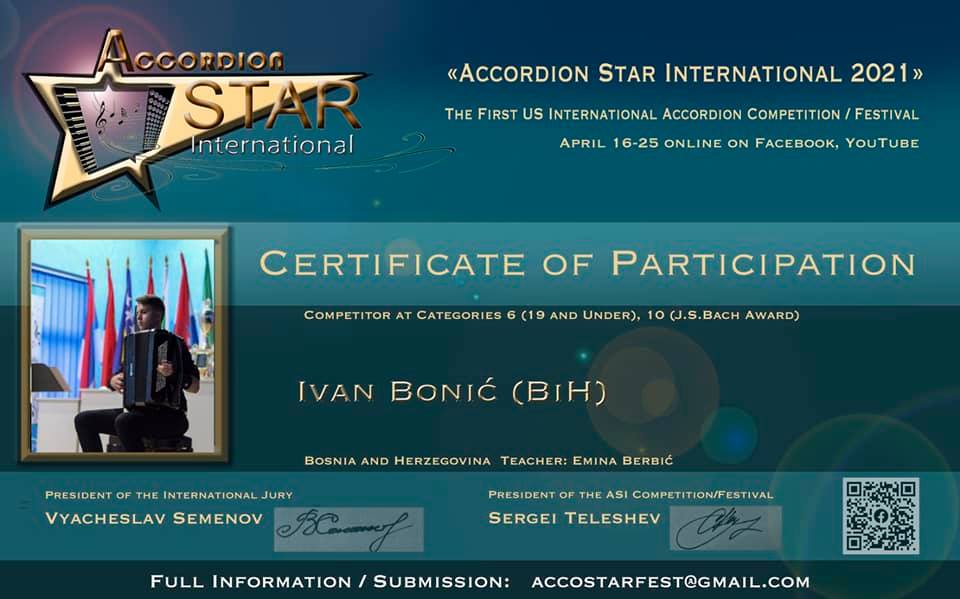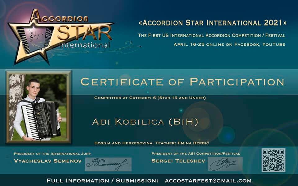 Učenici Srednje muzičke škole u Zenici, Ivan Bonić i Adi Kobilica, iz klase prof. Emine Berbić, učestvovali su na prvom online takmičenju “Accordion Star International 2021”.