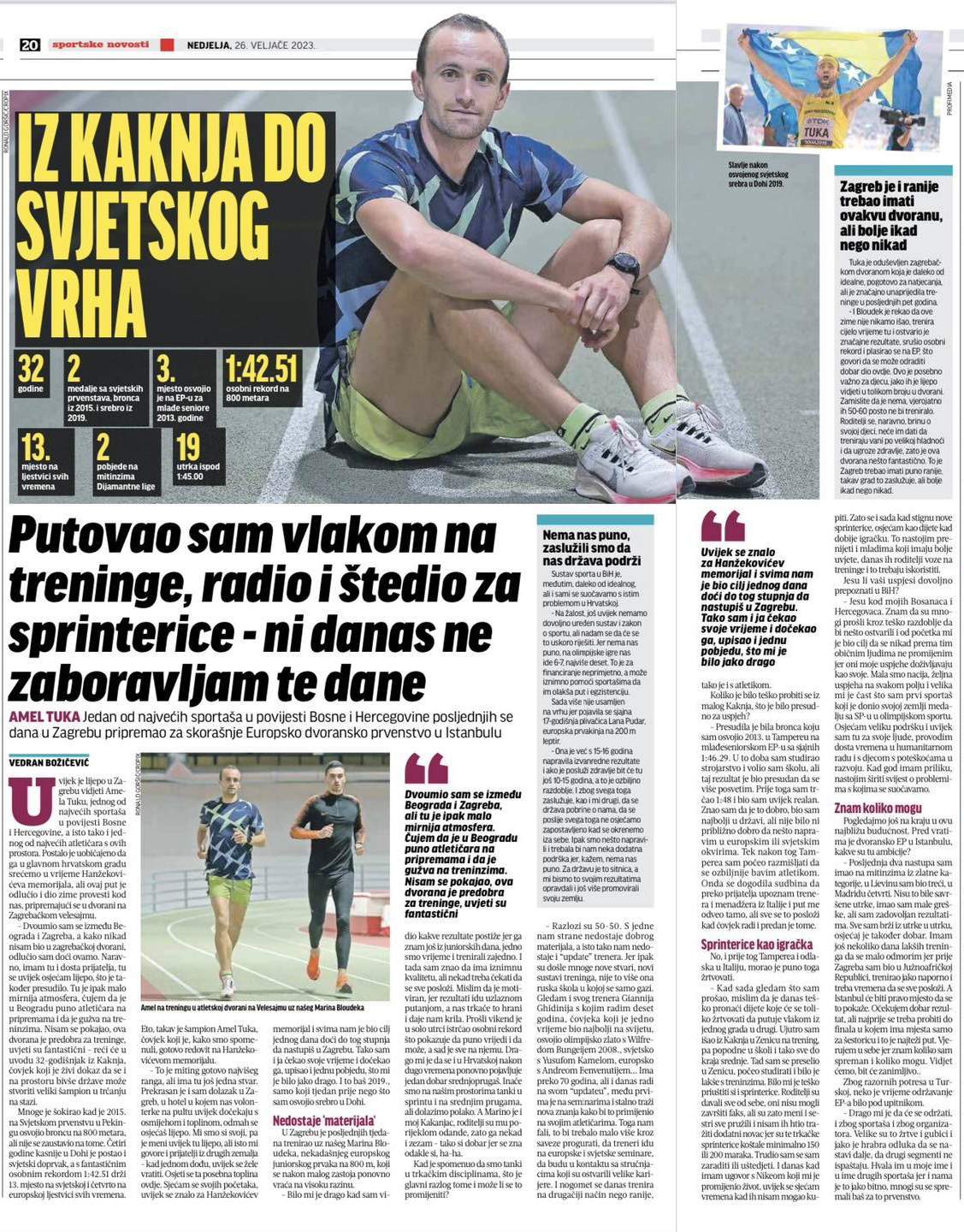 – Dvoumio sam se između Beograda i Zagreba, a kako nikad nisam bio u zagrebačkoj dvorani, odlučio sam doći ovamo. Naravno, imam tu i dosta prijatelja, tu se uvijek osjećam lijepo, što je također presudilo. Tu je ipak malo mirnija atmosfera, čujem da je u Beogradu puno atletičara na pripremama i da je gužva na treninzima. Nisam se pokajao, ova dvorana je predobra za treninge, uvjeti su fantastični – reći će u uvodu 32-godišnjak iz Kaknja, čovjek koji je živi dokaz da se i na prostoru bivše države može stvoriti veliki šampion u trčanju na stazi.