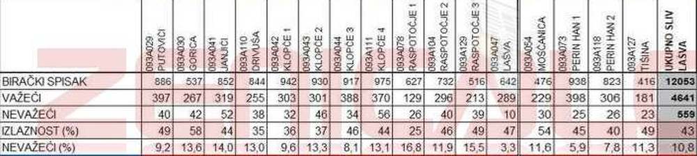 U Slivu Lašve više od 10 posto nevažećih imaju Gorica (13,6), Janjići (14,0), Drivuša (13,0), Klopče 2 (13,3), Klopče 4 (13,1), Raspotočje 1 (16,8), Raspotočje 2 (11,9), Raspotočje 3 (15,5), Mošćanica (11,6), te Tišina (11,3) posto. Broj nevažećih listića u ovom slivu je (prosječno) 10, 8 posto.