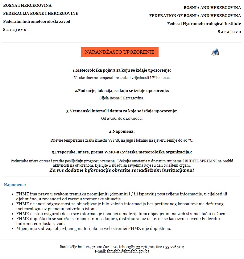 Meteorološka pojava zbog koje se izdaju upozorenja su visoke temperature, ali i visoka vrijednost UV indeksa. Ovo upozorenje se izdaje na teritoriji cijele BiH u periodu od 27. juna do 01. jula 2022. godine.