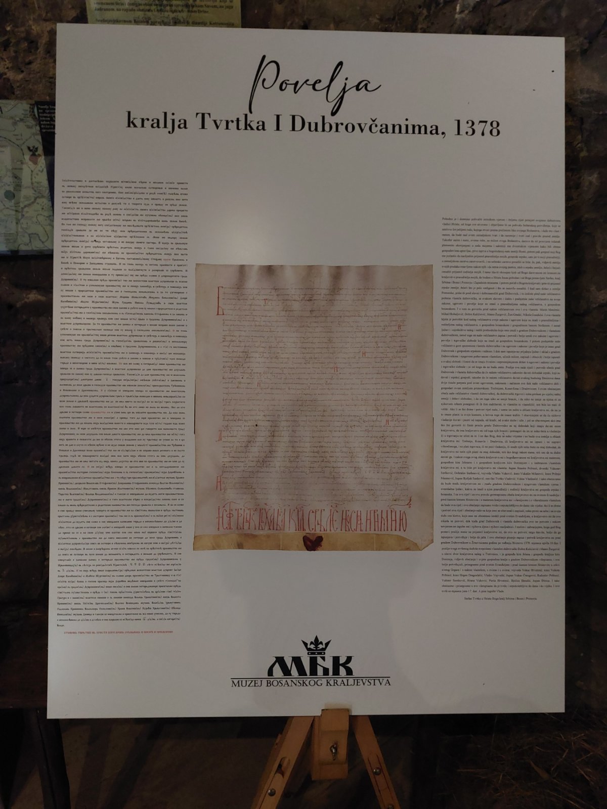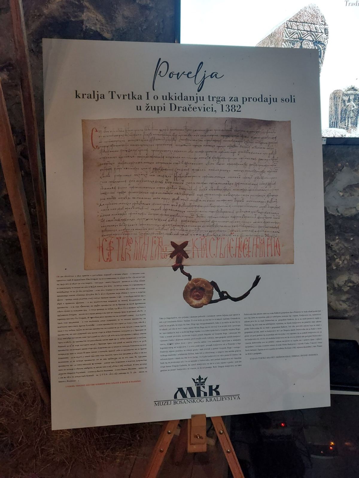 Odabrane povelje prate transformaciju bosanske države iz banovine u kraljevinu i upravo jedna povelja kralja Tvrtka I nudi odgovore na niz pitanja o uzdizanju Bosne u rang kraljevstva. Kroz ovih deset povelja se kristališe čitava paleta iskazivanja: od iskrenih ispovijesti, preko hladne diplomatije, do potpune neiskrenosti. Cilj izložbe jeste približiti građankama i građanima Bosne i Hercegovine glasove srednjovjekovnih Bošnjana u njihovom izvornom obliku. Transkripcija i prevod povelja omogućavaju svima zainteresiranima da na osnovu pročitanih rečenica bosanskih vladara i vlastelina donesu vlastiti sud o određenim događajima iz historije bosanskog srednjeg vijeka.”- dr. Enes Dedić.