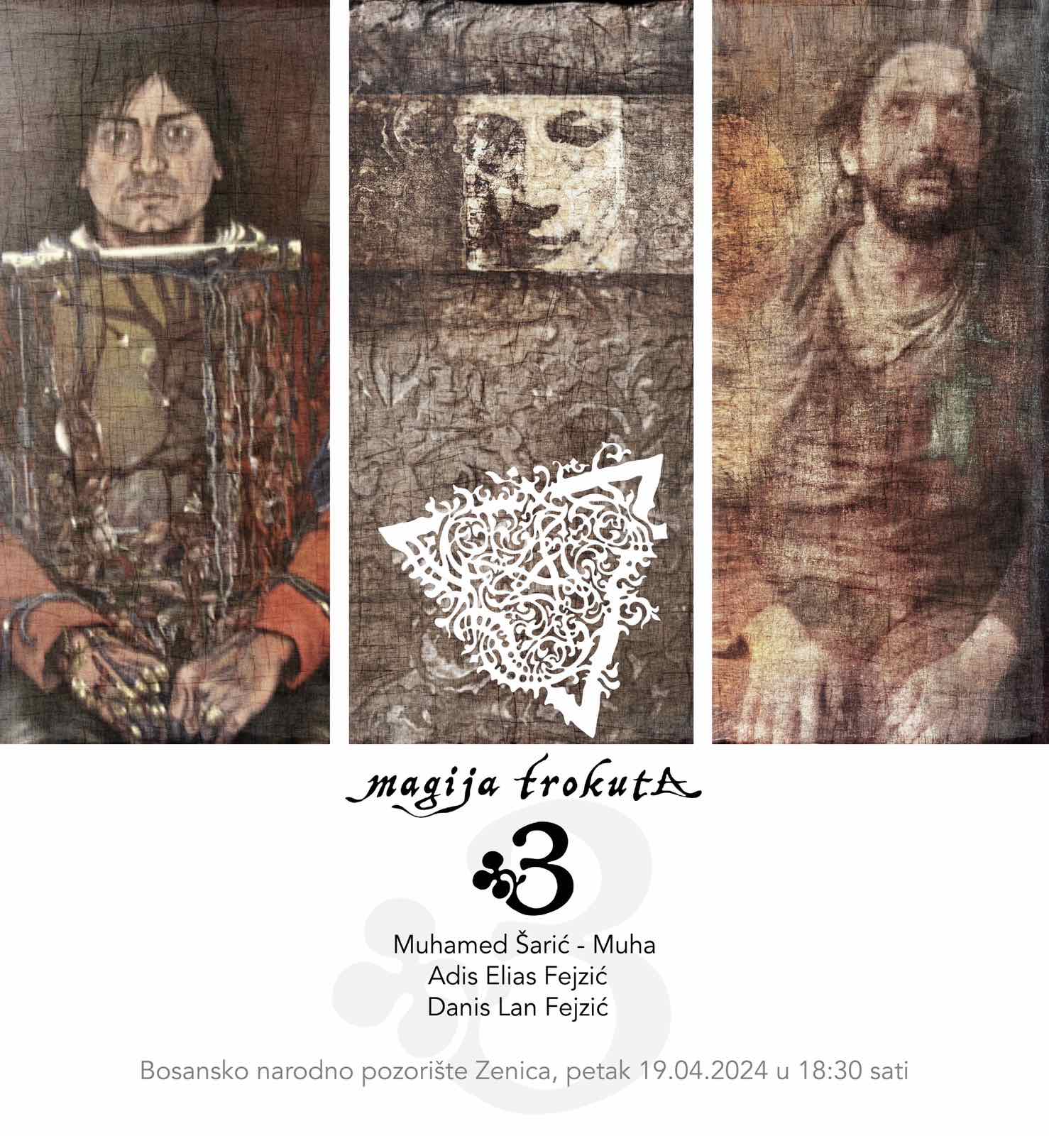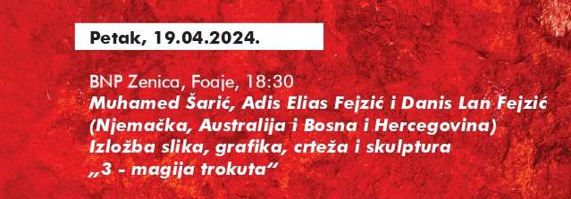 U sklopu 27. Međunarodne kulturne manifestacije (MKM) „Zeničko prolječe 2024“, večeras, 19.4.2024.godine, u foajeu Bosanskog narodnog pozorišta (BNP) postavljena je Izložba slika, grafika, crteža i skulptura „3 –magije trokuta), čiji su autori: Muhamed Šarić-Muha, Adis Elias Fejzić i Danis Lan Fejzić.