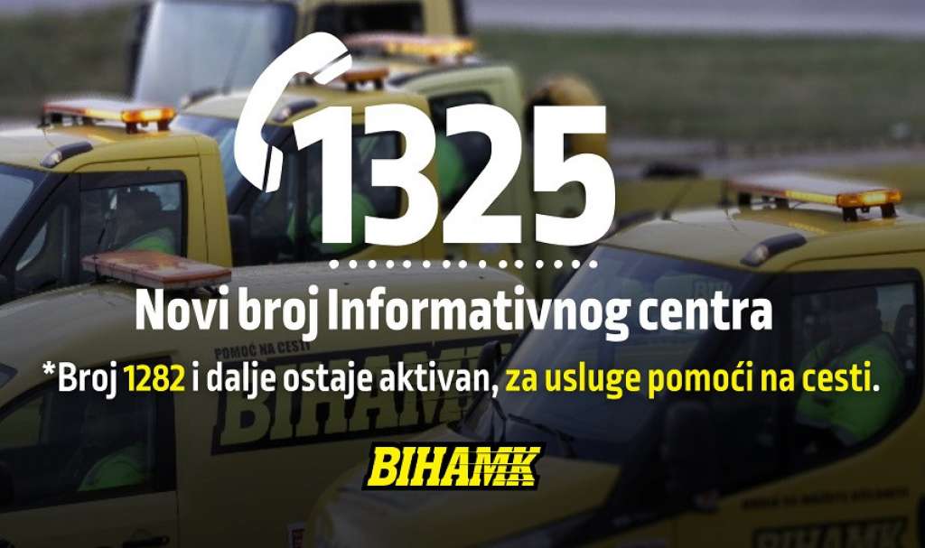 Umjesto dosadašnjeg telefonskog broja za upite o stanju na cestama – 1282, opcija 3, uveden je novi, izmijenjeni pozivni broj Informativnog centra BIHAMK-a: 1325 za informacije o stanju na cestama.