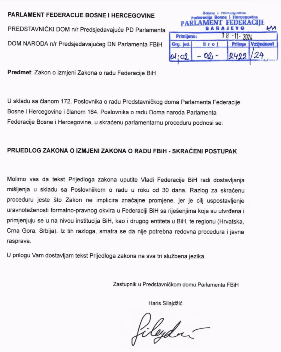 Prijedlog Zakona o izmjeni Zakona o radu FBiH koji je dostavio zastupnik u Predstavničkom domu Parlamenta FBiH Haris Silajdžić (SBiH) upućen je u parlamentarnu proceduru.