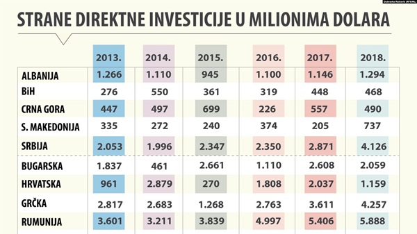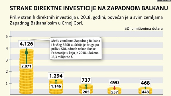 Prema “Izvještaju o investicijama u svijetu 2019” Konferencije UN o trgovini i razvoju (UNCTAD), najveći rast na Zapadnom Balkanu zabilježila je Sjeverna Makedonija u kojoj je priliv stranih direktnih investicija povećan za 260 odsto s 205 miliona dolara 2017. na 737 miliona dolara prošle godine. Srbija, koja ima najveći priliv stranih direktnih investicija u regionu, zabilježila je rast od 44 odsto na 4,1 milijarde dolara.