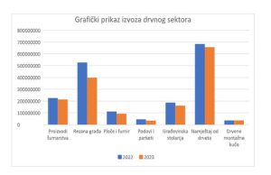 Najznačajniji izvozni proizvodi drvne industrije su oni finalnog stepena prerade (namještaj, građevinska stolarija i montažne kuće) koji zajedno čine 53,7 posto izvoza u 2023. godini, što je vrlo povoljna struktura izvoza. Najviše su se izvozila sjedala sa drvenim okvirima, namještaj za spavaće sobe, te namještaj za trpezarije i dnevne sobe. Izvoz montažnih kuća je bio u vrijednosti od 36 miliona KM, što je za 1,5 posto više nego u 2022. godini.