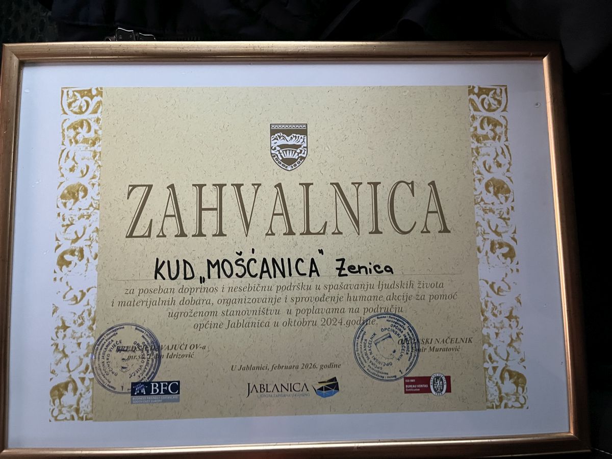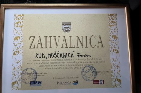 Kulturno-umjetničko društvo „Mošćanica“ iz Zenice dobitnik je zvanične Zahvalnice Općine Jablanica za poseban doprinos i nesebičnu podršku u spašavanju ljudskih života i materijalnih dobara, kao i za organizovanje i sprovođenje humanitarne akcije pomoći stanovništvu pogođenom poplavama na području ove općine tokom oktobra 2024. godine.