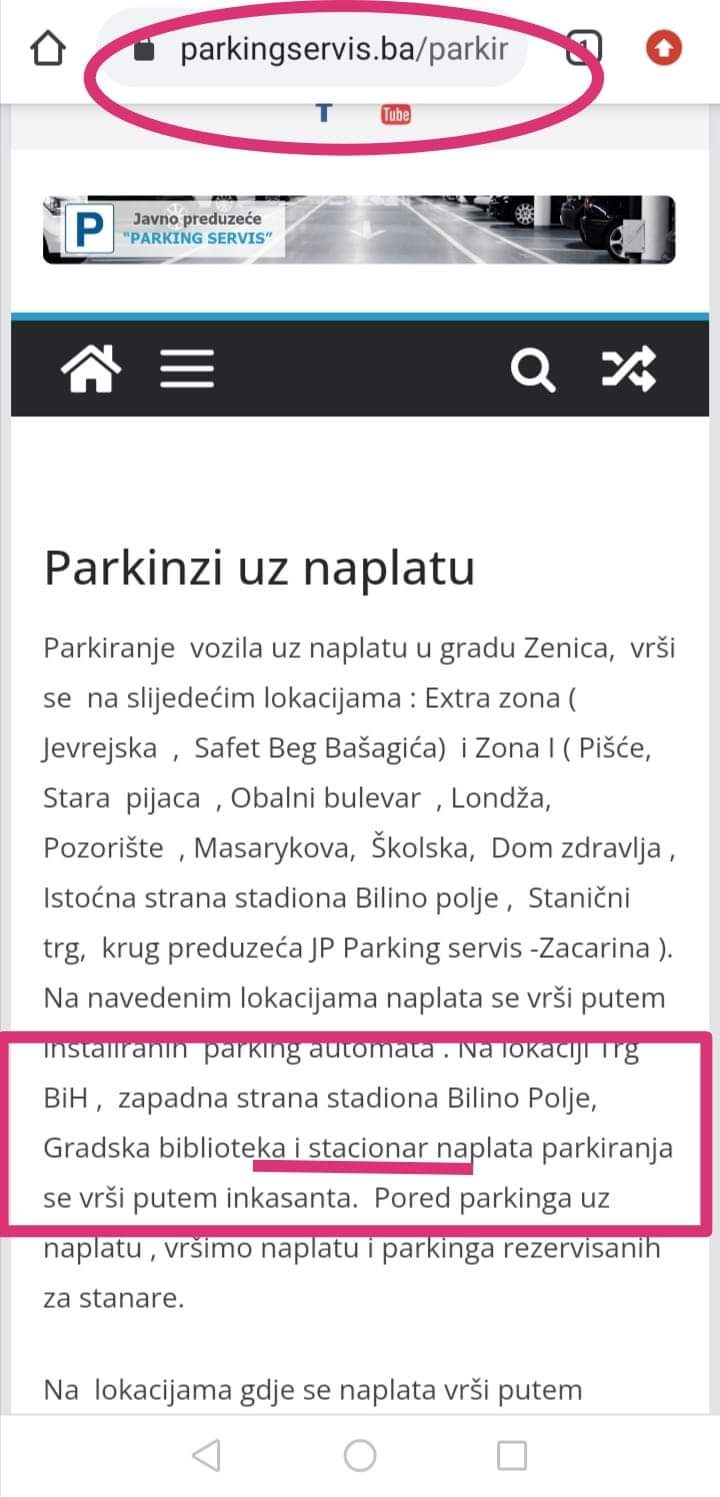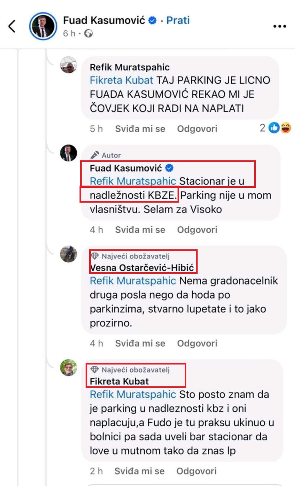Još zanimljivije je ispred Stacionara, gdje na osnovu table, oznaka na radnicima jasno da parking naplaćuje zeničko javno preduzeće, dakle Grad Zenica i njegovo JP. Na Facebook stranici gradonačelnika povela se polemika oko naplate, pa je izvjesna osoba, za koju gradonačelnik u konverzaciji kaže da je iz Visokog, je naveo “da mu je radnik rekao da je parking Kasumovićev”, naravno aludirajući žargonski da je u vlasništvu Grada (kao i mnogo toga drugog).