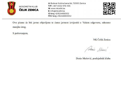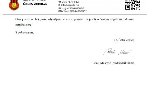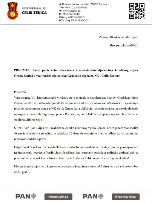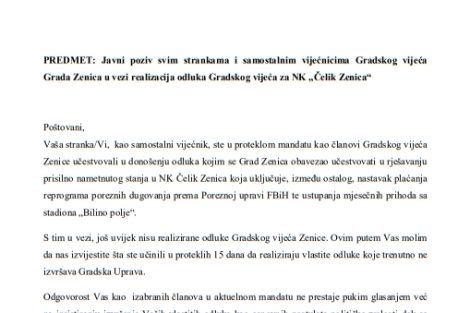 Javni poziv svim strankama i samostalnim vijećnicima Gradskog vijeća – Obzirom da još uvijek nisu realizirane odluke Gradskog vijeća u vezi plaćanja reprograma poreznih dugovanja prema Poreznoj upravi FBiH te ustupanja mjesečnih prihoda sa stadiona „Bilino polje“, nogometni klub “Čelik” uputio je danas dopis svim strankama i samostalnim vijećnicima Gradskog vijeća grada Zenice u vezi vezi realizacija odluka Gradskog vijeća za NK „Čelik Zenica“