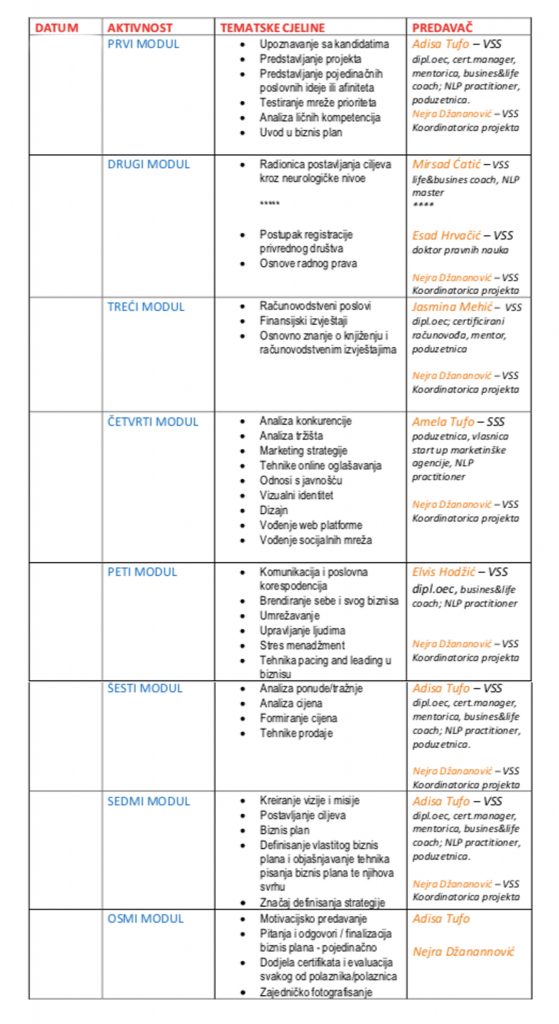 Projekt će se realizovati kroz osam cjelodnevnih modula (osam susreta) i planirano je da se završi do kraja decembra.