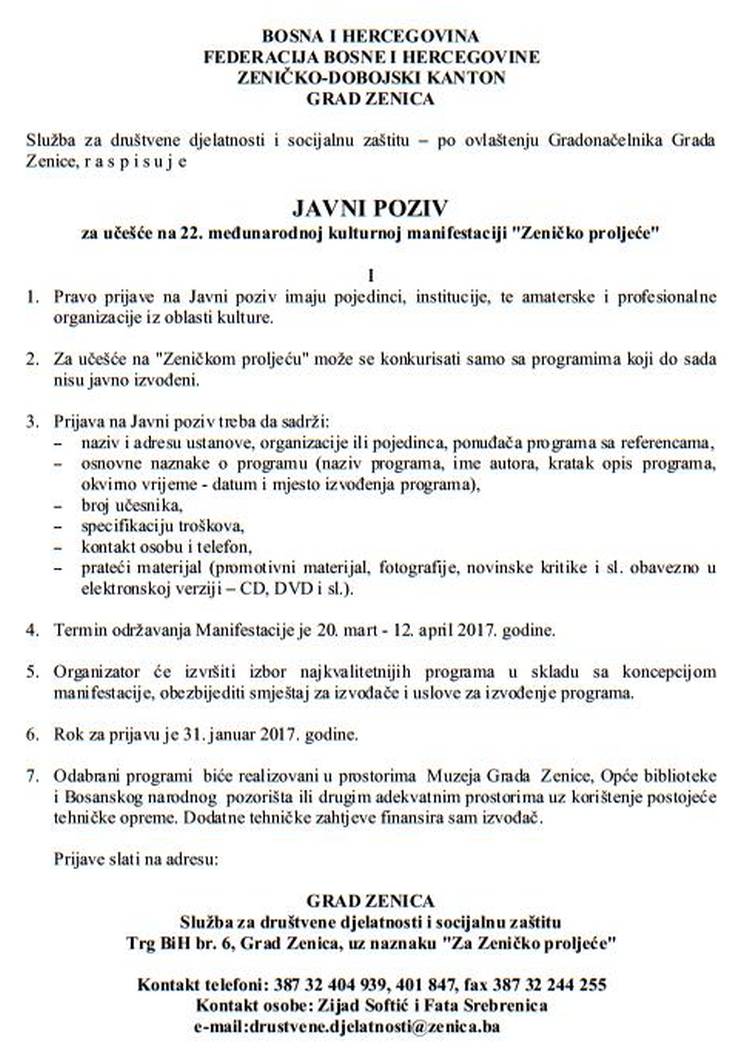 Javni poziv za prijavljivanje na MKM Zeničko proljeće 2017. – Služba za društvene djelatnosti  objavila je Javni poziv za učešće na 22. MKM “Zeničko proljeće” 2017. godine.
