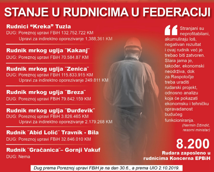 Podsjetimo, šest rudnika u Federaciji BiH, Poreznoj upravi FBiH duguje oko 500 miliona maraka, a u posljednjue vrijeme Vlada FBiH intenzivirala je napore da rudnici efikasnije posluju i redovno plaćaju porezne obaveze. U toku je dvomjesdečni rok u kojem rudnici trebaju početi izradu plana reorganizacije.