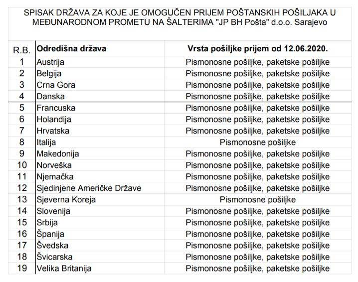 Iz JP BH POŠTA obavijestili su korisnike da se od 12.06.2020. godine uspostavlja prijem i paketskih pošiljaka u međunarodnom poštanskom prometu na šalterima JP BH Pošta d.o.o. Sarajevo za one odredišne zemlje za koje to do sada nije bilo moguće, a to su: Austrija, Belgija, Crna Gora, Danska, Francuska, Holandija, Hrvatska, Italija (samo pismonosne pošiljke), Makedonija, Norveška, Njemačka, Sjedinjene Američke Države, Sjeverna Koreja (samo pismonosne pošiljke), Slovenija, Srbija, Španija, Švedska, Švicarska i Velika Britanija.