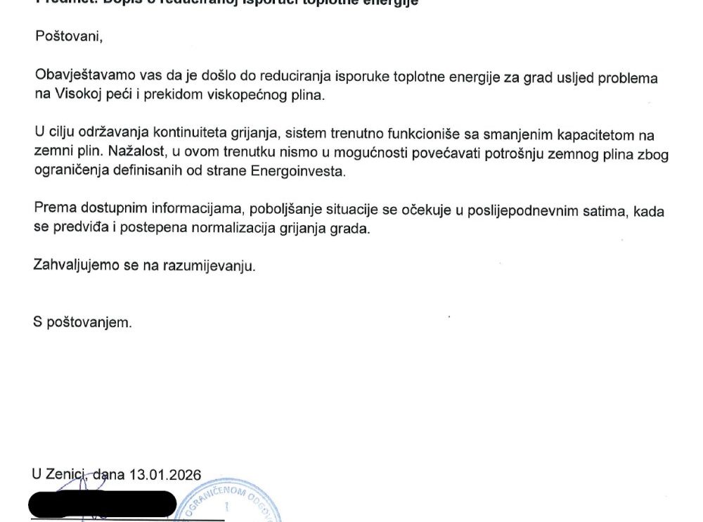 Obavještavamo vas da smo dana 13.01.2026. godine obaviješteni od strane Toplana Zenica d.o.o. Zenica da je došlo do redukcije isporuke toplotne energije.