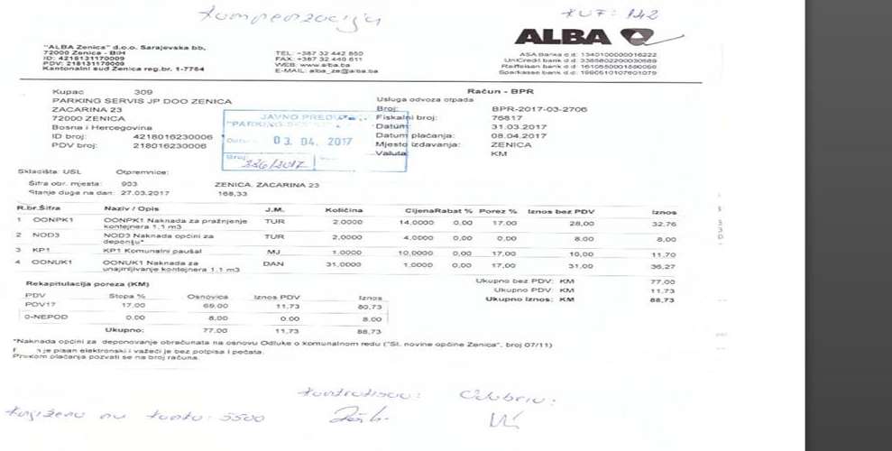 Demantujemo navode imenovanog da JP „Parking servis“ d.o.o. ne plaća Albi ili RD Mošćanici odlaganja otpada, s tim u vezi u prilogu akta dostavljamo Vam naš račun za plaćene usluge odvoza otpada od preuzeća Alba d.o.o. Zenica. Molimo imenovanog da ubuduće dobro razmisli prilikom objave ovakve vrste postova, jer ovakvim potezom narušava ugled preduzeća što u krajnjem slučaju može imati negativne posljedice na ukupno poslovanje.