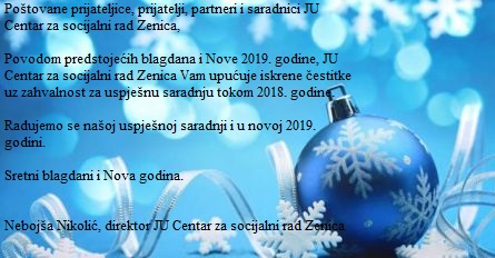 Povodom predstojećih blagdana i Nove 2019. godine, JU Centar za socijalni rad Zenica Vam upućuje iskrene čestitke uz zahvalnost za uspješnu saradnju tokom 2018. godine.