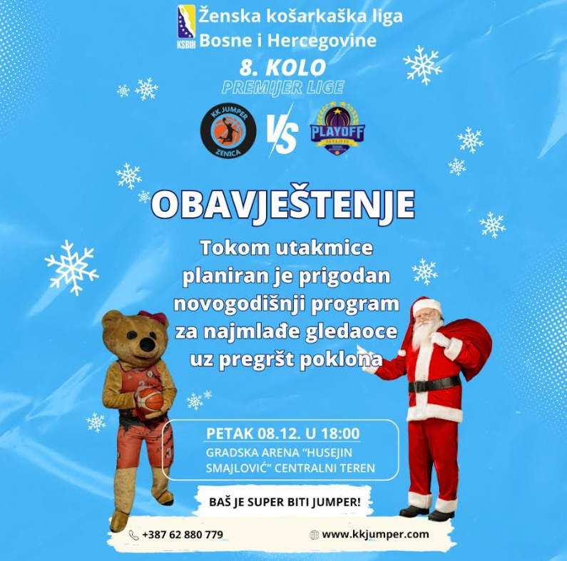 U okviru košarkaškog susreta između KK Jumper Zenica i KK Playoff Sarajevo, pripremili smo poseban novogodišnji program za naše najmlađe posjetitelje. Djed Mraz dolazi s punom vrećom poklona, spreman da podijeli radost i osmijehe. Naša maskota Jumperko također će se pridružiti zabavi, osiguravajući da svako dijete ponese kući pregršt lijepih uspomena.