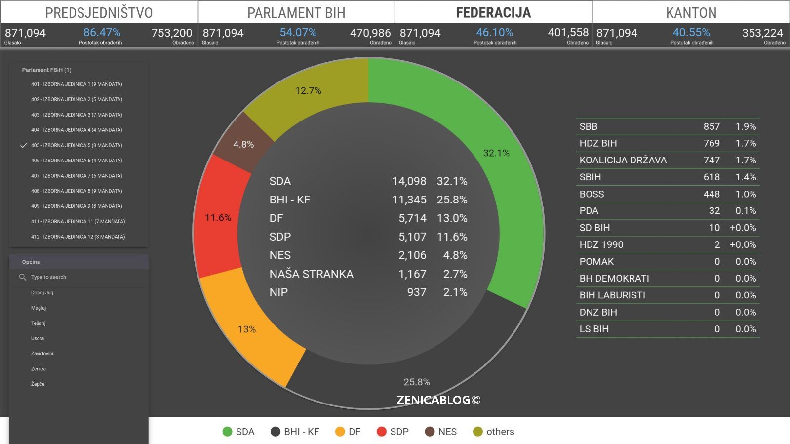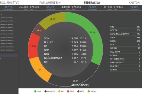 Prema podacima na uzorku od preko 40 posto pregledanih glasova, jutros iza 9 sati, SDA ima ubjedljivu prednost za novi saziv Skupštine ZDK. Na osnovu podataka koji su prikupljani direktno sa birališta, SDA ima 31, 2, BHI – KF 17, 6, SDP 11 posto…. Bitno je napomenuti da u ovaj zbir još nisu unesene općine sa “hrvatskom većinom”.