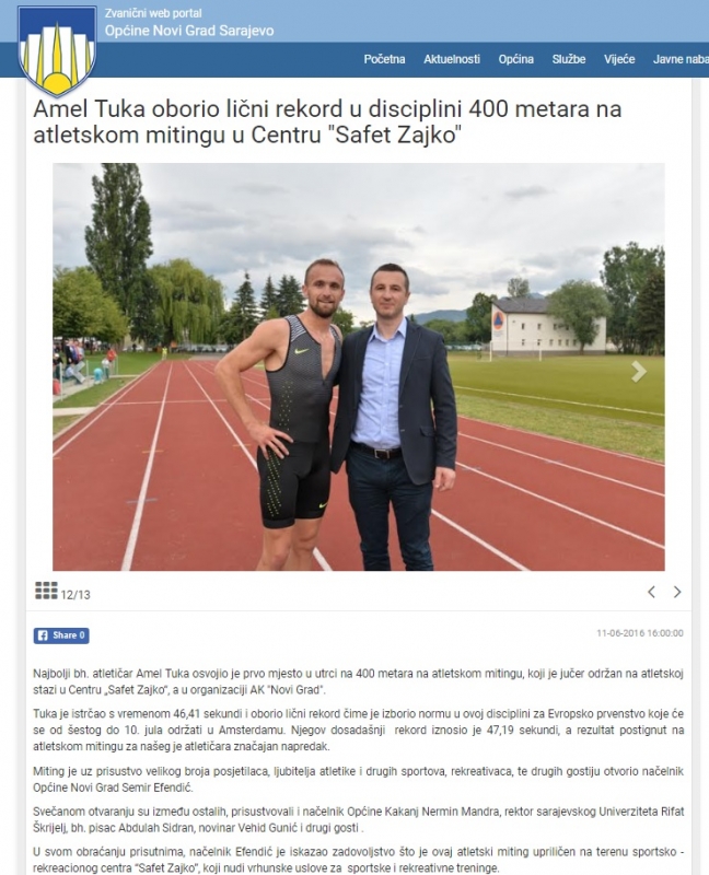 Amel Tuka u julu. 2016. godine osvojio je četvrto mjesto na utrci 800 metara na Europskom prvenstvu u atletici u Amsterdamu. Samopouzdanje za ovakav poduhvat, najbolji bh. atletičar dobio je mjesec prije, kada je oborio svoj lični rekord na 400 metara. Ovo obaranje rekorda dogodilo se, gdje drugo, nego na mjestu gdje je obaranje rekorda zagarantovano – u sportskom centru “Safet Zajko”. Lični rekord Tuka je, kojeg li čuda, “popravio”za čitavih 78 stotinki, sa vremenom 46:41, čime je izborio normu u ovoj disciplini za Evropsko prvenstvo u Amsterdamu. Očito je da zbog dužine staze, Tuki kasnije ovaj rezultat nije priznat jer je u devetom mjesecu iste godine za državni rekord na ovoj dionici proglašeno vrijeme 46:63.