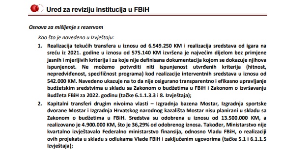 – Revizijom smo utvrdili da je realizacija sredstava tekućih transfera u iznosu od 6.549.250 KM (transferi za: sport od značaja za FBiH, kulturu od značaja za FBiH, obnovu kulturnog i graditeljskog naslijeđa, institucije nauke i kulture od značaja za BiH i mlade) izvršena najvećim dijelom bez primjene jasnih i mjerljivih kriterija, zbog čega se izbor korisnika u najvećoj mjeri zasnivao na subjektivnoj ocjeni članova komisije za bodovanje pristiglih zahtjeva.