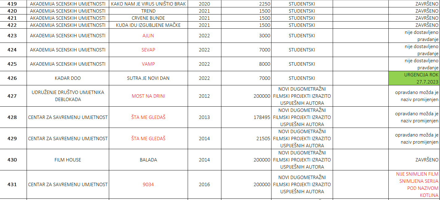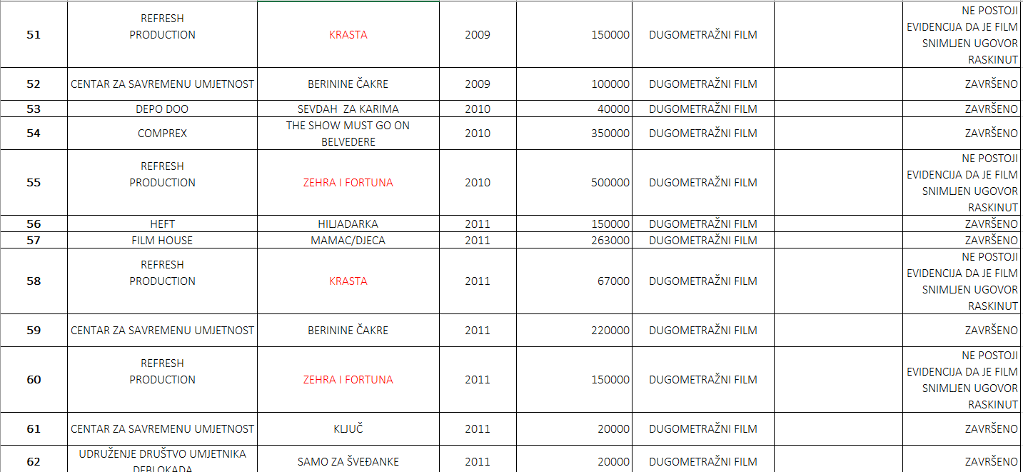 Kad smo već kod fiskalne odgovornosti, u tabeli sufinansiranih projekata Fondacije u koju smo imali uvid, pored desetina projekata uz komentar o utrošku sredstava piše: “Opravdano, možda je naziv filma promijenjen”. Neki od tih projekata jesu snimljeni i radni naziv im je promijenjen. No, neki nisu nikada ugledali svjetlo dana. I opet, radi se o stotinama hiljada maraka iz budžeta Fondacije. Potpuno je nevjerovatno da umjesto tačne evidencije ishoda ovih projekata pored njih stoji riječ “možda” – možda jesu, a možda i nisu realizirani, to niko izgleda ne zna reći sa sigurnošću. Jedino što je sigurno je da nijedan od tih filmova nije deponovan u Kinoteku BiH. A prema potpisanom sporazumu sa Kinotekom iz 2020. godine, oni koji nisu dostavili svoje filmove u Kinoteku ne mogu aplicirati na konkurse Fondacije za nove projekte.