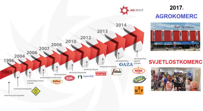 AS Group 2013. godine preuzima vodu Oaza, od koje također pravi veliki domaći brend, a potom slijedi još jedna prelomna godina, 2014., kada tešanjska firma preuzima sarajevske gigante Klas i Sprind, kao i Mlin i pekare Ljubače i time definitivno postaje lider u proizvodnji hrane na domaćem tržištu.