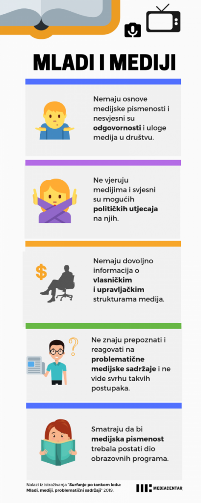 Kako mladi koriste medije? – Mladi u BiH nemaju osnove medijske pismenosti i nisu svjesni društvene odgovornosti medija. Ipak, znaju da su mogući politički utjecaji na medije i smatraju da bi medijska pismenost trebala postati sastvani dio obrazovnih programa. To su neki od zaključaka istraživanja “Surfanje po tankom ledu: Mladi, mediji, problematični sadržaji”, na osnovu kojeg su učesnici i učesnice omladinskog kampa trebali napraviti infografiku.