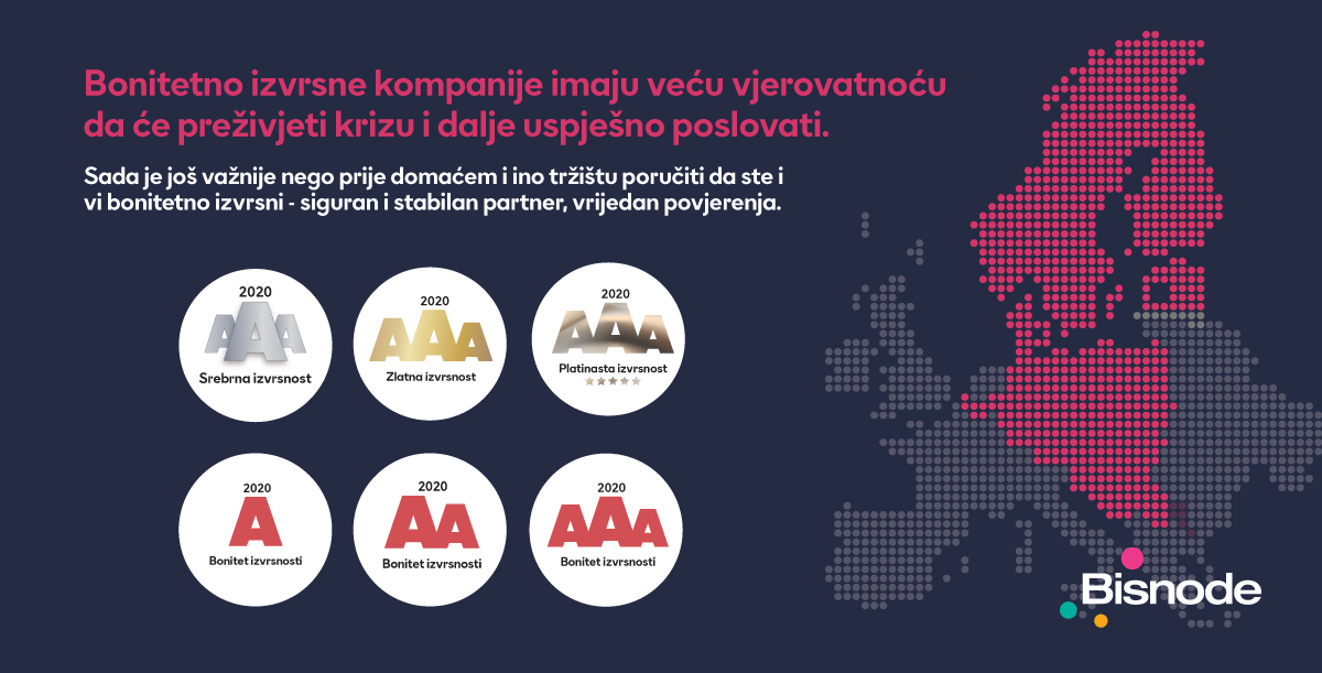 Kako steći povjerenje na tržištu i dobiti nove poslove? – Jeste li ugledna, vjerodostojna kompanija? Mogu li vaši poslovni partneri to potvrditi? Kako posluju kompanije s kojima do sada niste sarađivali? Sada je još važnije nego prije domaćem i međunarodnom tržištu poručiti: „Mi smo siguran i stabilan partner, vrijedan povjerenja. Partner koji će biti uz vas čak i u vrijeme ekonomske krize.“ Certifikatom bonitetne izvrsnosti potvrđujete da pripadate uskom krugu kompanija, klubu poželjnih poslovnih bh. partnera, gdje se, prema trenutnom Bisnode istraživanju, nalazi samo 19% bh. kompanija s natprosječnim kvalitetom poslovanja.