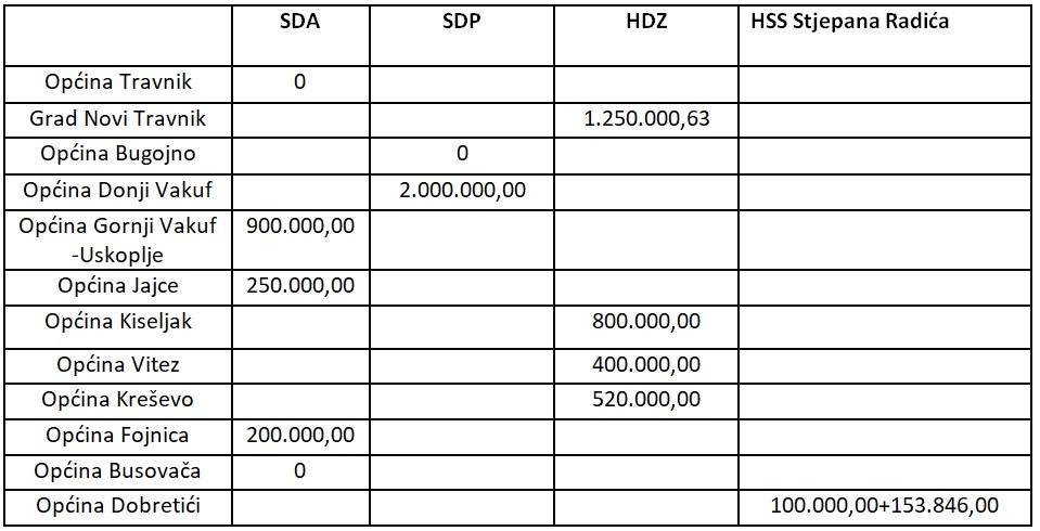 Niti jednu marku nije dobila najmnogoljudnija općina Travnik, inače centar kantona. Sa druge strane, čak 2 miliona KM je dobila općina Donji Vakuf u kojoj je na posljednjim izborima izabran načenik iz reda SDP-a.