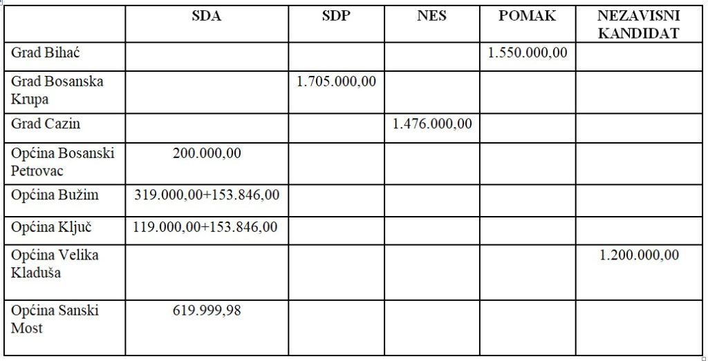 Idemo do Unsko-sanskog kantona. Kanton se sastoji od osam općina: Bihać, Bosanska Krupa, Bosanski Petrovac, Bužim, Cazin, Ključ, Sanski Most i Velika Kladuša. Sve ove lokalne zajednice su “nagrađene” od federalne vlasti u ukupnom iznosu od 7,5 miliona KM, ali ne adekvatnom iznosu. SDA je pobijedila u četiri od osam općina na zadnjim izborima (Bosanski Petrovac, Ključ, Sanski Most, Bužim). Ove općine su ukupno dobile 1,56 miliona KM. Samo Bosanska Krupa u kojoj je na posljednjim izborima načelničku poziciju osvojio SDP-ov Armin Halitović dobila je više od svih navedenih općina zajedno – 1,7 miliona KM. Bihać je dobio 1,55 miliona KM, Cazin je dobio 1,47 miliona KM, Velika Kladuša 1,2 miliona KM.
