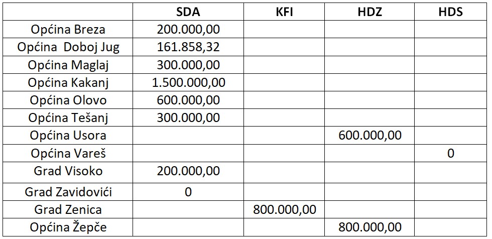 Za sve gradove/općine koje imaju (grado)načelnika iz SDA izdvojeno je iz ove budžetske stavke ukupno 1,84 miliona KM. Za samo dva grada u kojima SDP ima gradonačelnika izdvojeno je približno znatno više – 2,45 miliona KM. Ukupno u općine u kojima SDA nema načelnika izdvojeno je 4,7 miliona KM.