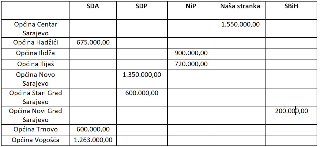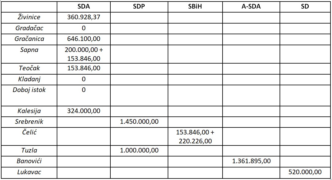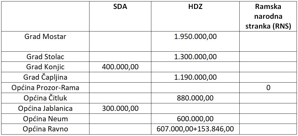 Za sve gradove/općine koje imaju (grado)načelnika iz SDA izdvojeno je iz ove budžetske stavke ukupno 1,84 miliona KM. Za samo dva grada u kojima SDP ima gradonačelnika izdvojeno je približno znatno više – 2,45 miliona KM. Ukupno u općine u kojima SDA nema načelnika izdvojeno je 4,7 miliona KM.