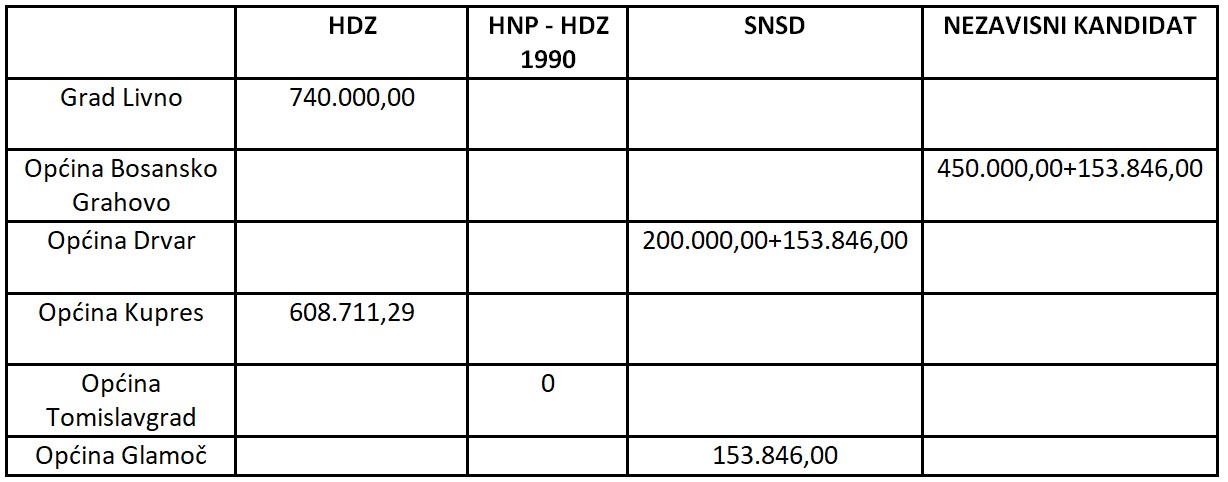 U Zapadnohercegovačkom kantonu su četiri općine (Grude, Grad Ljubuški, Posušje i Grad Široki Brijeg) i u svima je na vlasti HDZ. Iz budžeta Federacije BiH dodijeljeno im je ukupno 3,36 miliona KM i naravno nijedna općina nije uskraćena za sredstva.