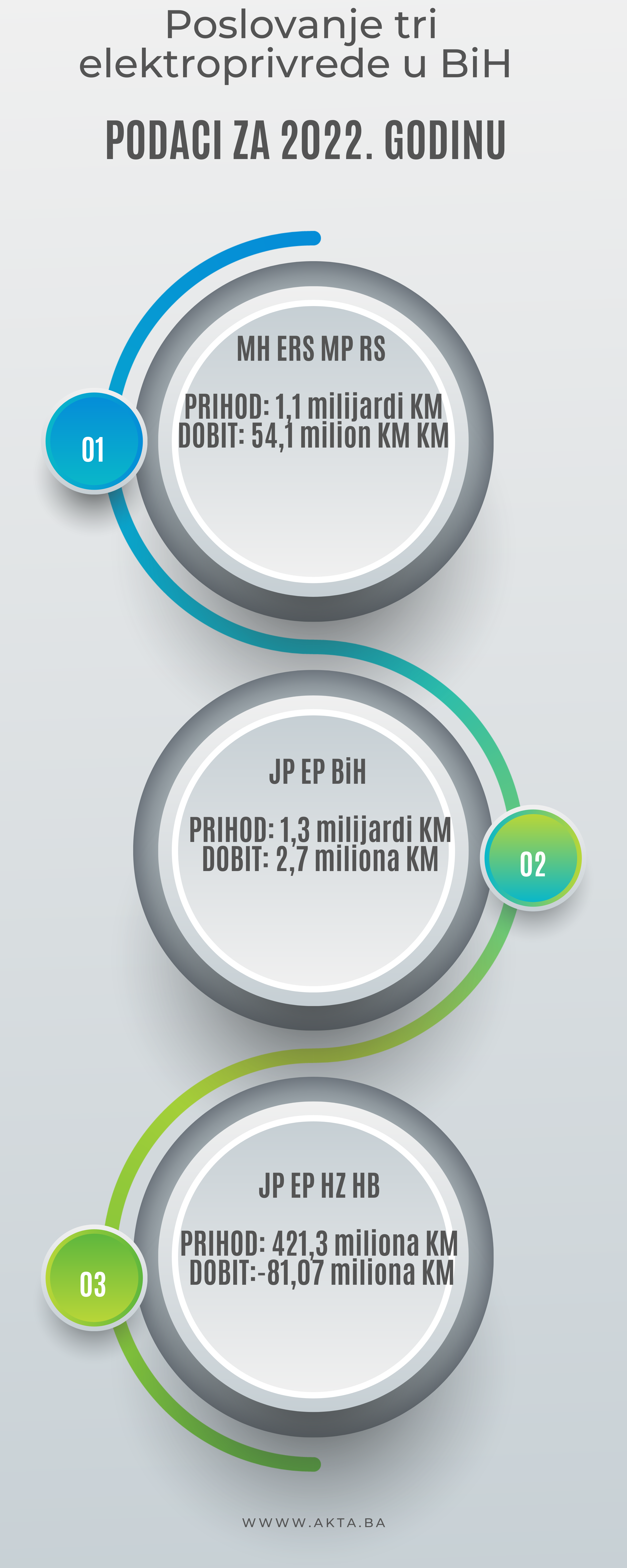 Analizirajući finansijske izvještaje poslovanja tri bh. elektroprivrede u 2022. godini, zaključujemo da je Elektroprivreda BiH ostvarila najveći prihod, dok je Elektroprivreda RS prva po dobiti. Elektroprivreda HZHB je poslovala s velikim gubitkom i znatno manjim prihodom nego godinu ranije.