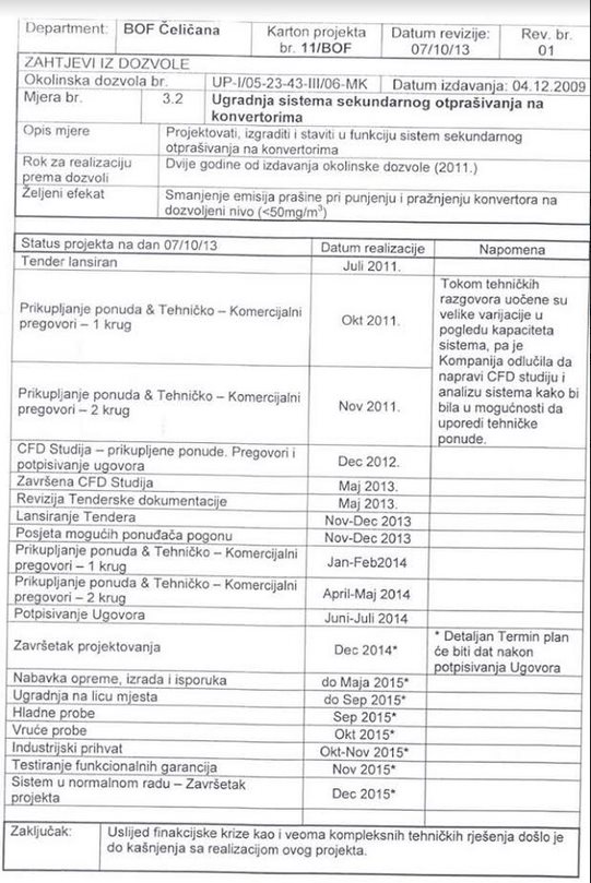 Problem sa BOF-om se javlja unatrag nekoliko okolinskih dozvola pa je i na OD od 2009.g. bio potpuno definisan problem, zadaci i rokovi. Pod mjerom 3.2 je definisan projekat – Ugradnja sistema sekundarnog otprašivanja na konvertorima i po termin-planu je početak aktivnost definisan za juli 2011.g. i kraj definisan sa izgrađenim postrojenjem i puštenim u normalan rad dec.2015.g. Po starom, već dokazanom načinu komotnog ponašanja i znajući da ih niko neće ni počešati zbog toga, AMZ otkazuje projekat opravdavši se time da je nastupila finansijska kriza. Ta kriza ih nije omela da ostvare profit i u toj i sljedećoj godini. Na isti način se odvijala i odvija sapunica zvana Aglomeracija, gdje su svi filteri trebali biti u radu još od 2008.g. Oni su svečano pustili u rad prvi filter ove 2017.g. , dakle 9 godina poslije roka. Ostale, manje bitne razloge ovdje nećemo elaborirati i ovaj i mnogo sličnih divno ilustruje sve manjkavosti okolinskih dozvola u kojima nema sankcija na neizvršavanje postavljenih zadataka. Kako će dalje teći ova sapunica oko BOF-a ostaje da vidimo jer je navedeno postrojenje još i predmet sudskog postupka. Ja čvrsto vjerujem u onaj skorašnji pronalazak lijeka protiv raka. Toliko o BOF-u.
