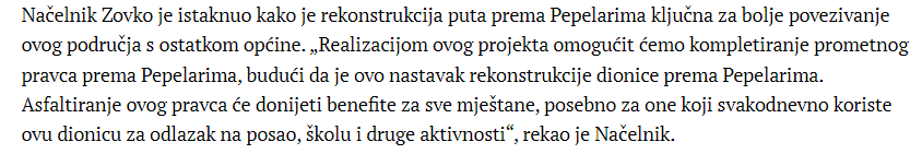 I dok su ostale općine i gradovi već potpisali ugovore sa odabranim izvođačima, npr. u Žepču već rade put prema Pepelarima što je takođe moja želja, zenički gradonačelnik je tek objavio javni poziv! Zašto? Da li je do drugih, drugačijih ili njega i njegovih saradnic(k)a! Do njega je Zeničani. Radi se o klasičnom neradu i neznanju, nesaradnji sa drugim i drugačijim. Istina, revizija je utvrdila brojne nezakonitosti i zloupotrebe prilikom raspisivanja javnih nabavki, pa je to možda razlog kašnjenja rekonstrukcije puta za Smetove.