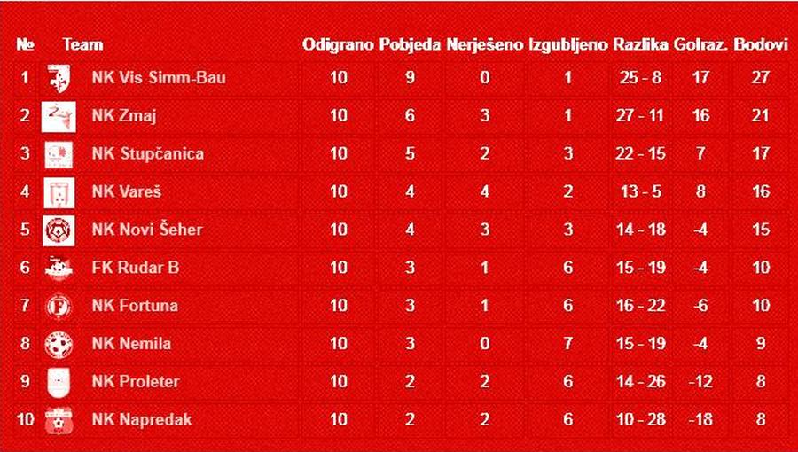 U 10. kolu zabilježene su dvije domaće, dvije gostujuće i jedna neriješena utakmica. Vrijedne gostujuće pobjede ostvarili su nogometaši zeničke Fortune u Šijama, strijelac za Fortunu bio je Vedad Ćatić u 21′,  te vodeći Vis Simm-Bau u Brezi. Nemila se nakon pobjede  protiv Vareša, strijelac Amir Sinanović u 36.minuti, pomakla sa zadnjeg mjesta.