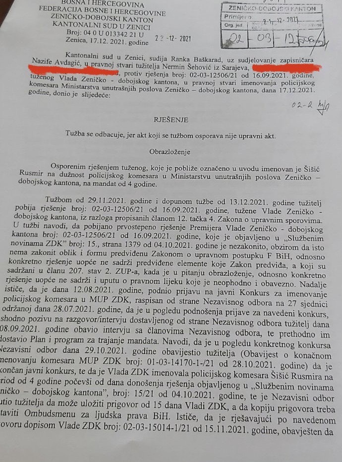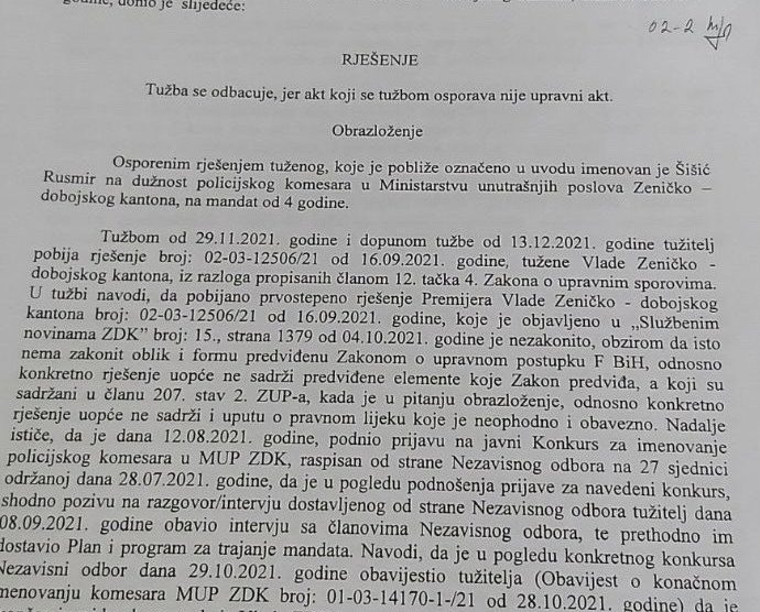 Kantonalni sud u Zenici donio je rješenje kojim odbacuje tužbu Nermina Šehovića po kojoj je tužio Vladu ZDK radi izbora policijskog komesara. Šehović je u septembru prošle godine bio kandidat za poziciju policijskog komesara ZDK, za koju je izabran drugi kandidat, Rusmir Šišić, službenik Uprave policije MUP-a ZDK.