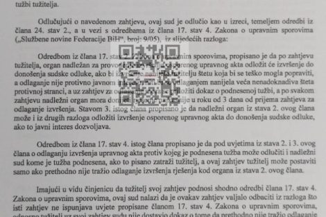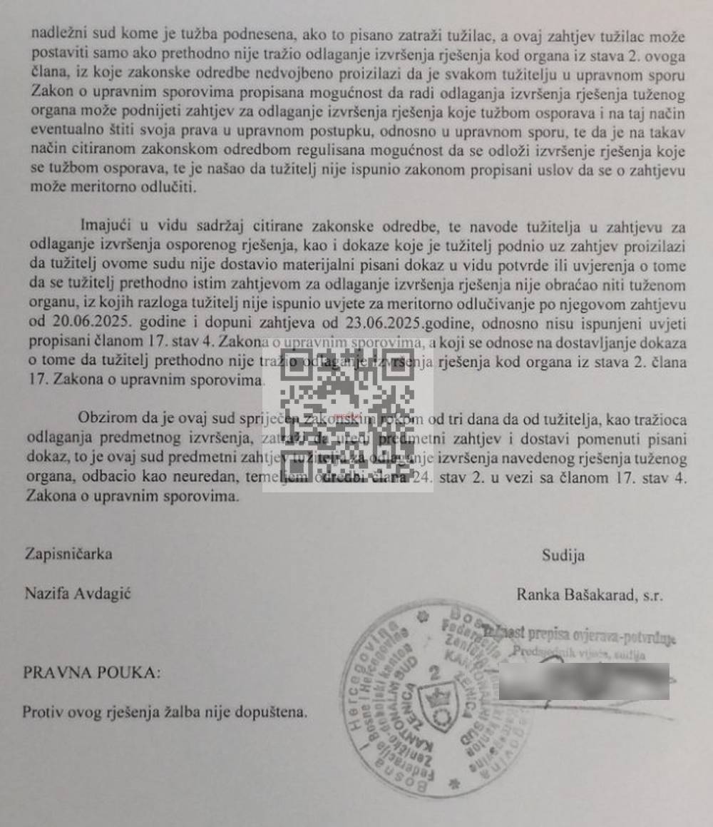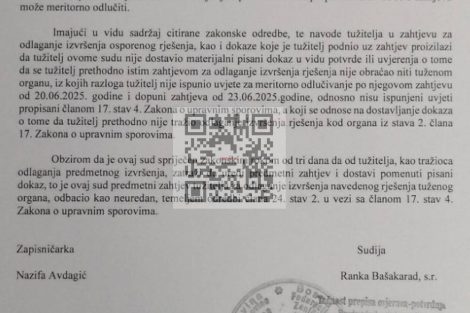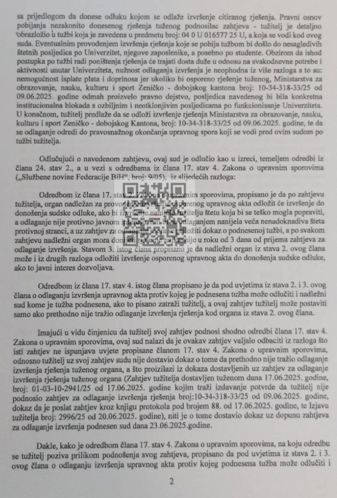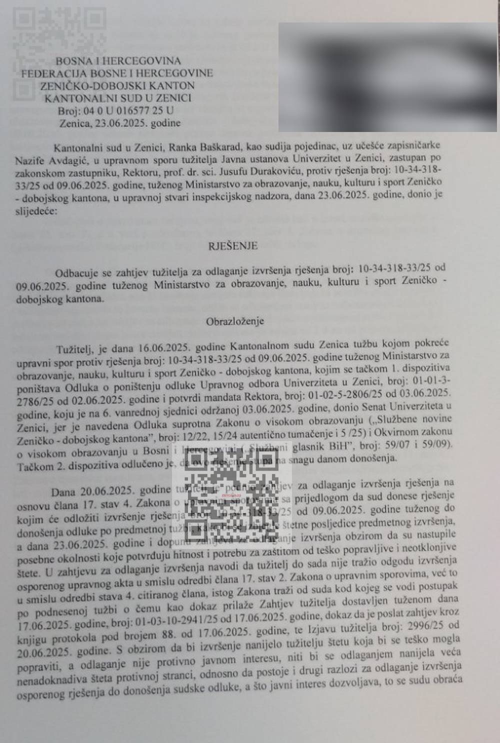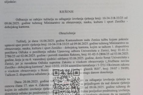 Sutkinja Kantonalnog suda u Zenici, Ranka Baškarad, u upravnom sporu tužitelja Univerziteta u Zenici, protiv rješenja tuženog Ministarstva za obrazovanje, nauku, kulturu i sport Zeničko-dobojskog kantona u upravnoj stvari inspekcijskog nadzora, dana 23.06.2025. godine, odbacio je zahtjev tužitelja za odlaganje izvršenja rješenja broj: 10-34-318-33/25 od 09.06.2025. godine tuženog Ministarstvo za obrazovanje, nauku, kulturu i sport Zemičko – dobojskog kantona.