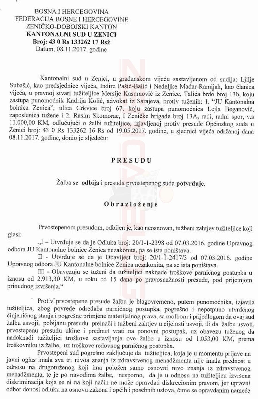 Tekst pravosnažne presude Zenicablog donosi u cjelosti. Podsjećamo, suprug kandidatkinje, aktuelni gradonačnik Zenice Fuad Kasumović najavio je da će “nakon što supruga i on dobiju presudu tražiti odštetu od ZDK i bolnice”, pa je u medijskim nastupima pominjao i budući odštetni zahtjev od 200.000 KM u vidu izgubljenih plaća i naknada, dok je u tužbenom zahtjevu radni spor procijenjen na “11.000 KM”.