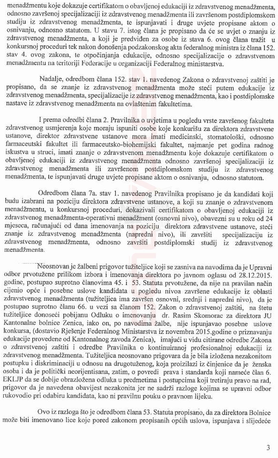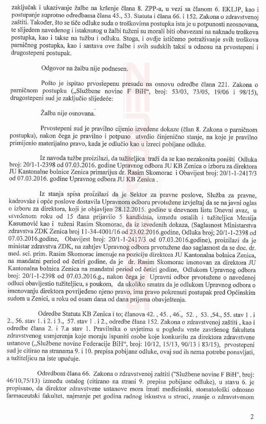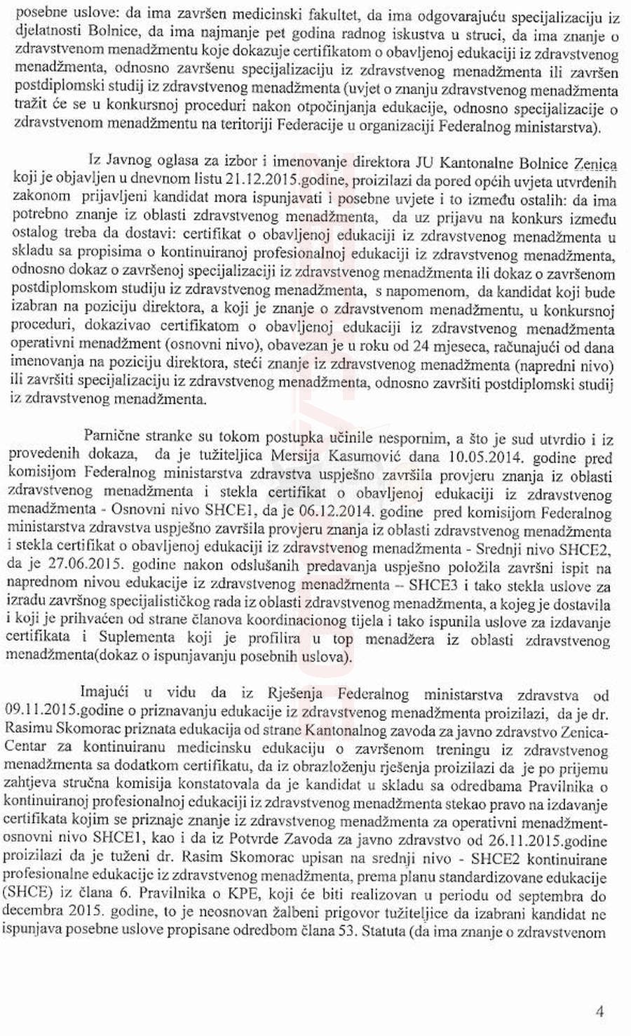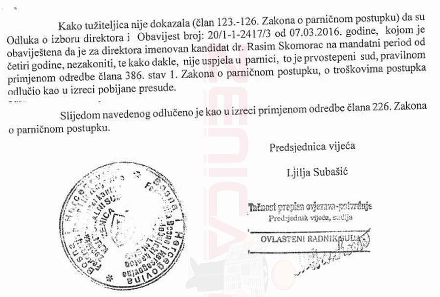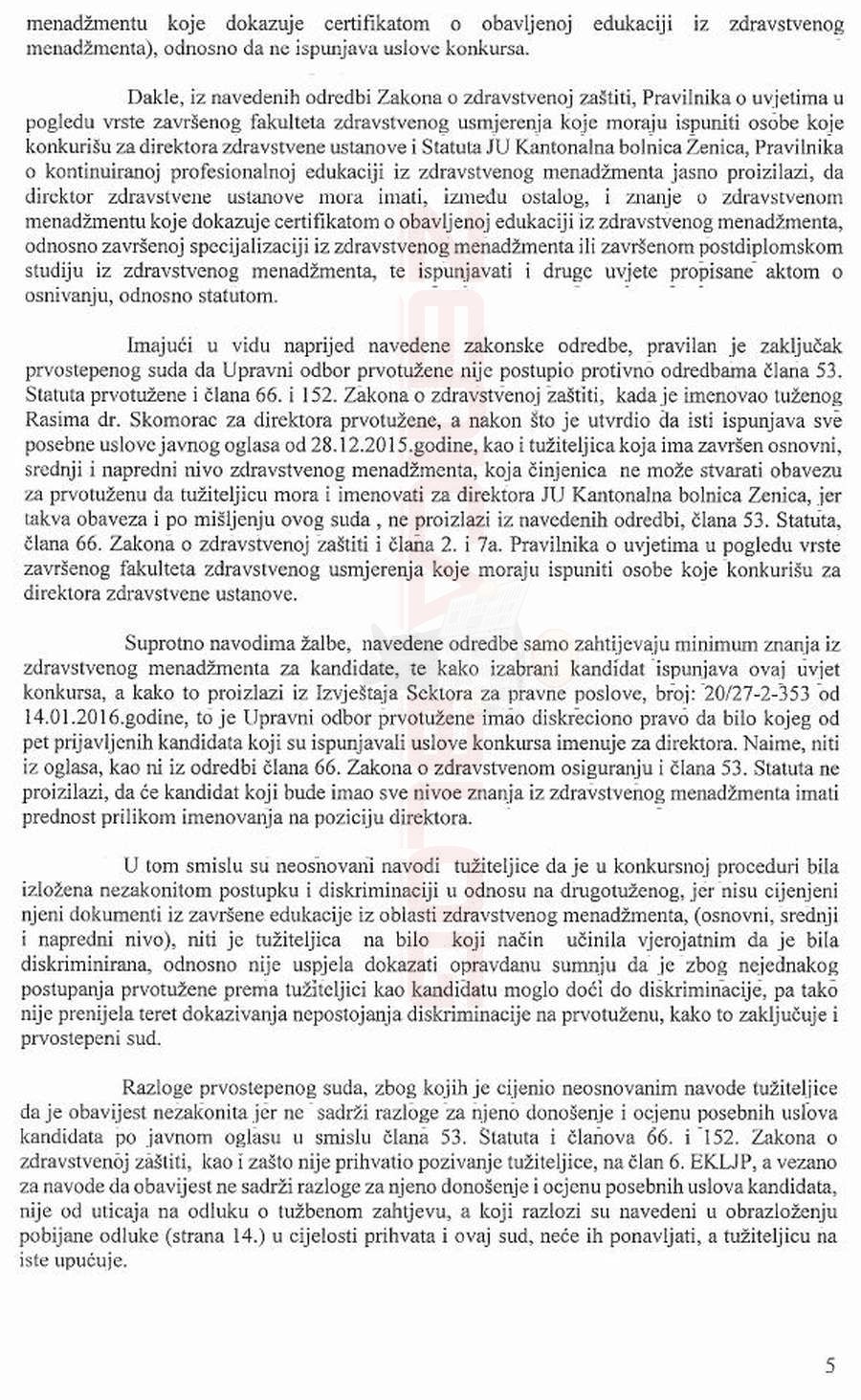 Podsjećamo, Kasumović je, nakon što je Skomorac izabran za direktora KBZ, a ona podijela tužbu, aplicirala i izabrana za direktoricu Zavoda medicine rada, koji je također kantonalna medicinska institucija, gdje bila jedini kandidat na poziciju direktora. Općinski, a onda i Kantonalni sud u Zenici smatraju da zahtjev tužiteljice nije bio utemeljen. Pročitajte obrazloženje i tekst presude.