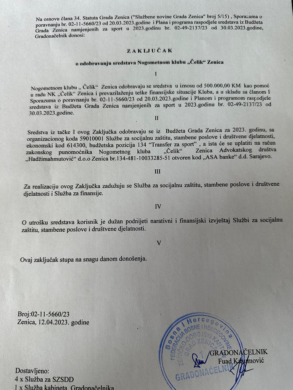 Kasumović potpisao Zaključak, NK Čelik odobreno pola miliona KM