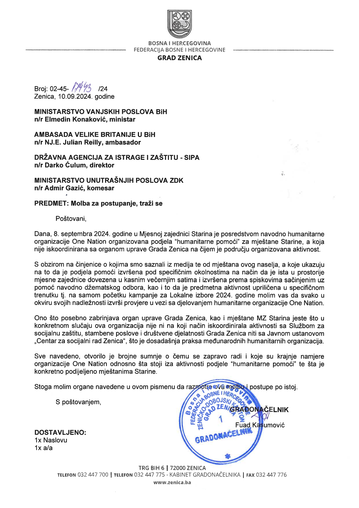 Dana, 8. septembra 2024. godine u Mjesnoj zajednici Starina je posredstvom navodno humanitarne organizacije One Nation organizovana podjela “humanitarne pomoći” za mještane Starine, a koja nije iskoordinirana sa organom uprave Grada Zenica na čijem je području organizovana aktivnost.